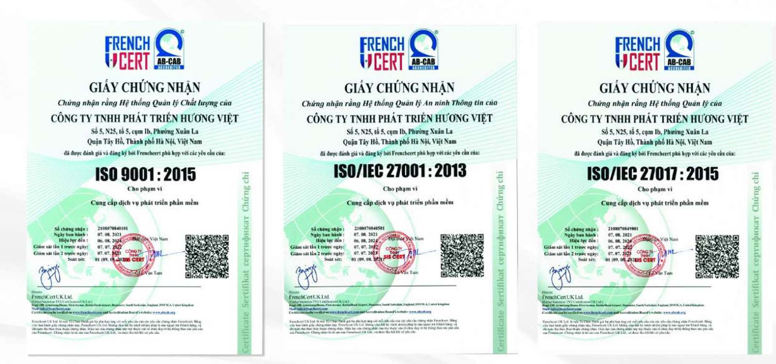 ISO 9001:2015 – Hệ thống quản lý chất lượng cho dịch vụ phần mềm.